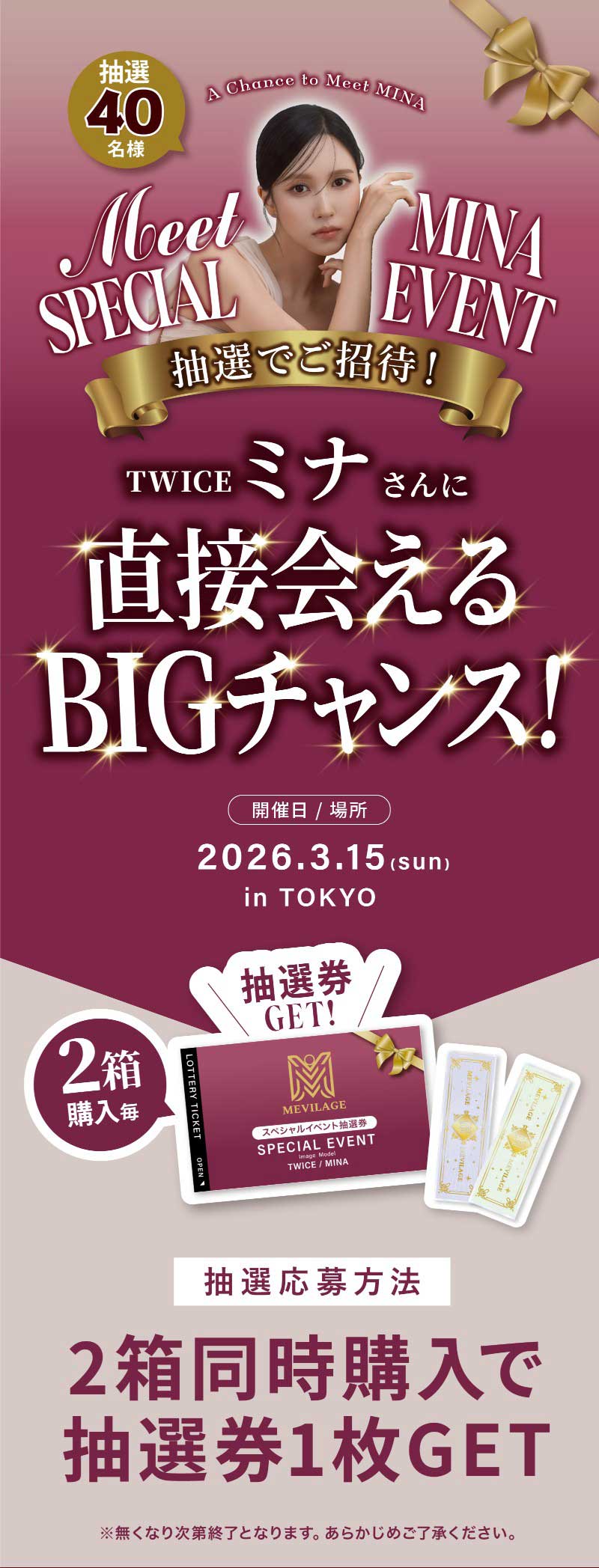 MEVILAGE(メビラージュ)を2箱同時購入で、抽選券1枚GET!